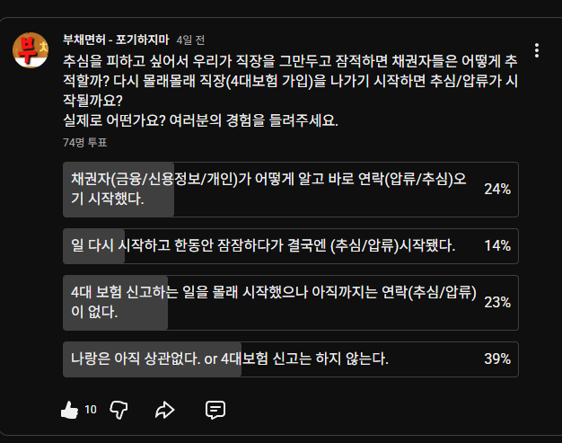 최근 저희 채널에서 진행한 설문 조사는 신용불량 상태에 놓인 분들이 겪는 가장 현실적인 공포를 보여주었습니다. 바로 ‘4대 보험 신고’와 ‘급여 압류’에 관한 문제입니다.